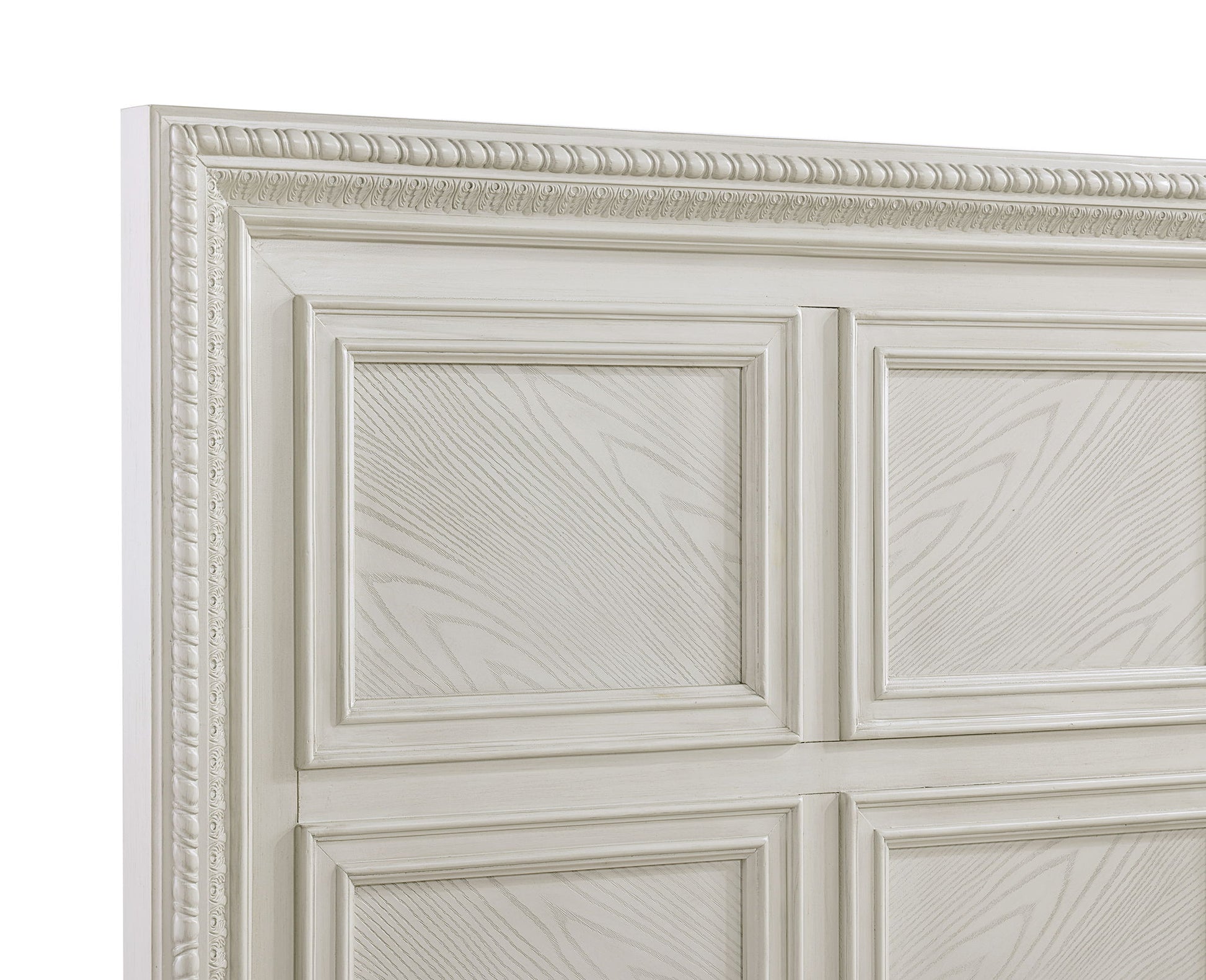 Introducing a bedroom collection that brings a breath of fresh sophistication to any living space. This suite boasts a bright, antique finish that immediately brightens and opens up a room, providing a versatile foundation for any decor style. The bed's commanding headboard stands as a stately centerpiece, with architectural paneling details that convey a sense of sturdy elegance. Storage needs are gracefully met by the dresser and chest, each accented with refined drawer pulls that offer a subtle contrast and easy access.
