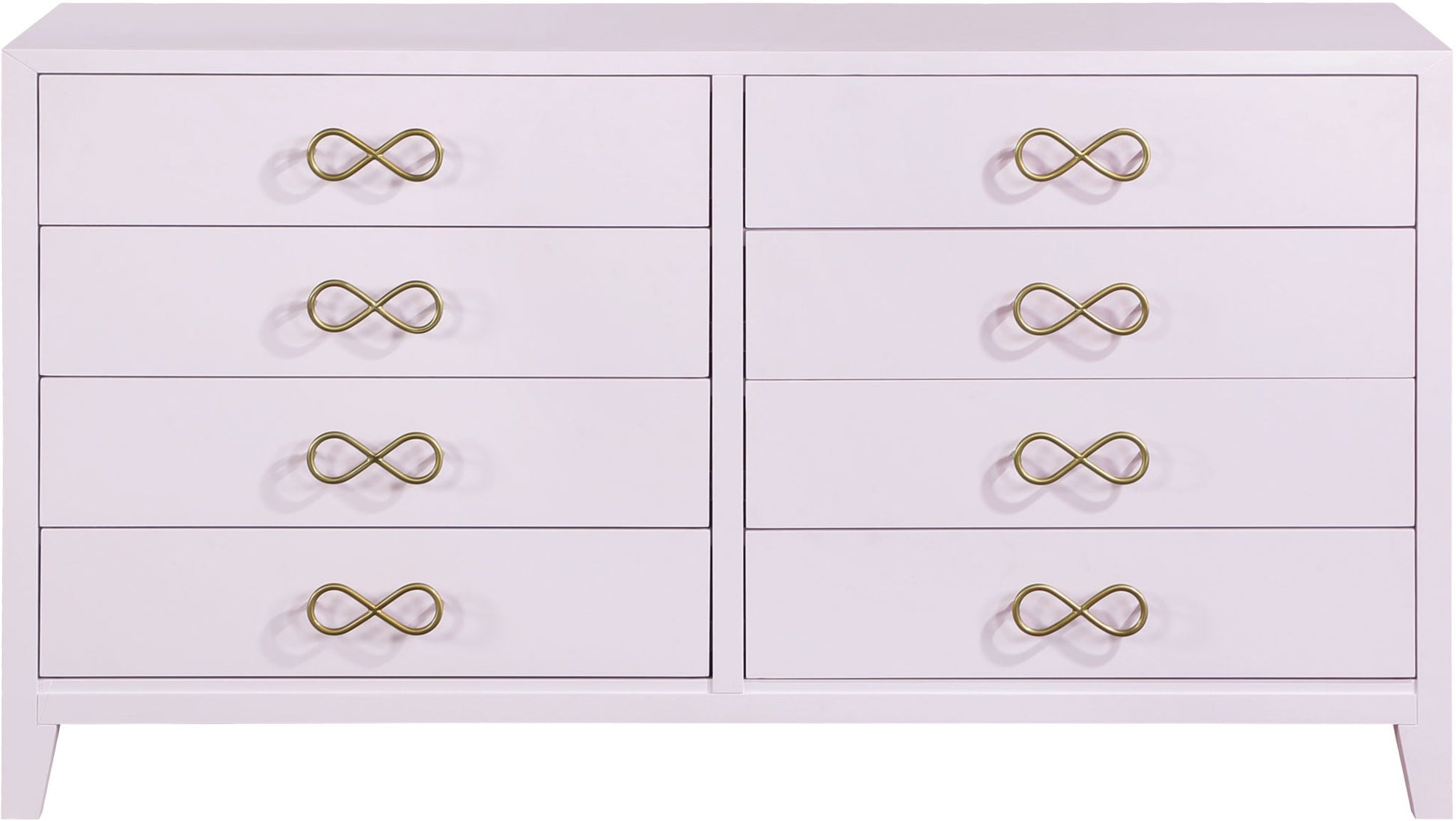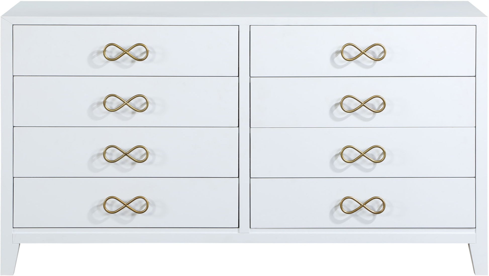 Bring unique elegance to your bedroom with this Bowtie dresser from Meridian Furniture. This dresser features eight drawers, providing you with plenty of storage space for clothes, linens, or miscellaneous objects. Its light color adds a touch of femininity to your living space, and its brushed bow tie handles complement your existing decor. Its flat top is perfect for placing a lamp, framed picture, books, bric-a-brac, and more.