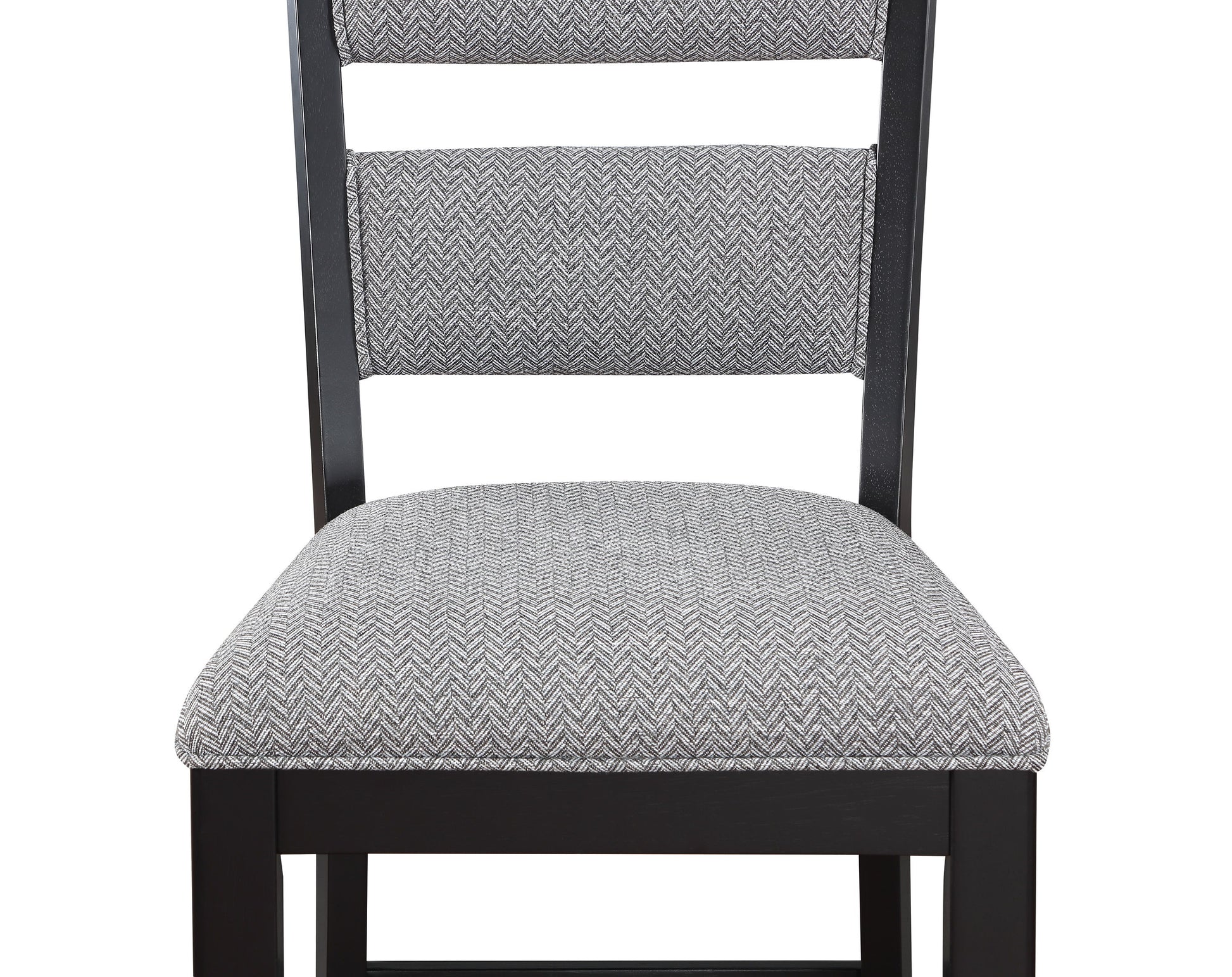 Bring a fresh look to your dining space with this breezy counter height group. The table has an array of design features, including drawers, bottle storage, and an open bottom shelf. Ladderback chairs and bench are upholstered in a Chevron pattern fabric with piping detail.