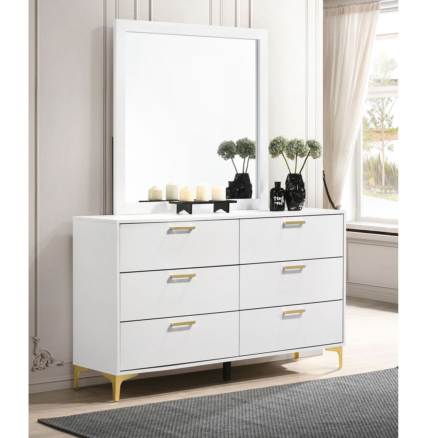- Modern Glam Design: Gold-finished drawer pulls and bracket-style legs elevate the dresser's luxurious appeal
