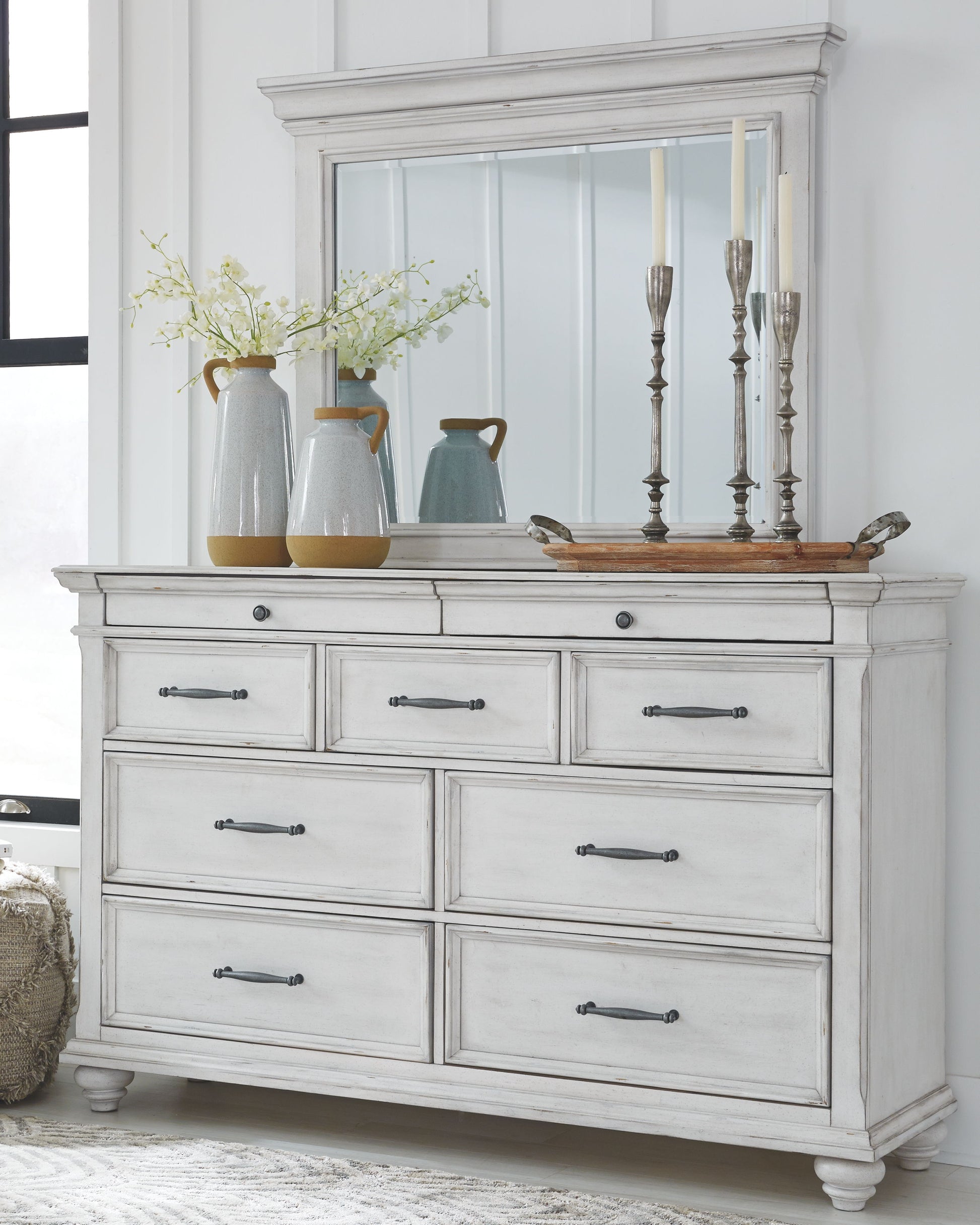 Made with veneers and select hardwood solids in a distressed whitewashed finish. Design features updated traditional styling with generously scaled moulding details. Dresser features 7 full sized drawers with 2 small scaled accessory drawers. Ball bearing side glides. Hardware has a transitional aesthetic and is finished in a dark gray pewter color. Mansion style headboard options feature a picture framed panel or inset tufted taupe upholstery cushion. Optional storage bench footboard.