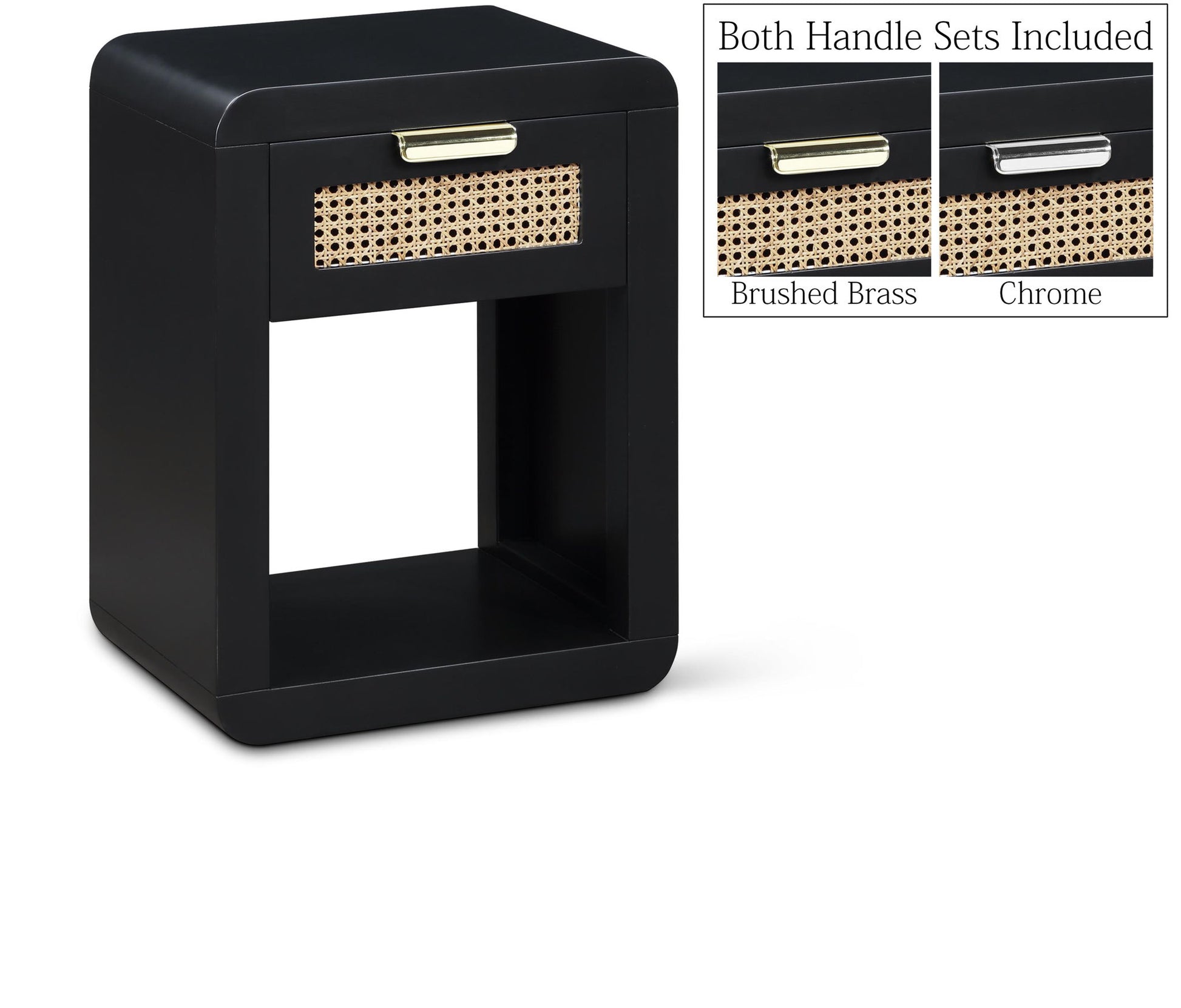 Lend your bedroom a distinctive touch with this Langham night stand from Meridian Furniture. Featuring an open, rectangular design and a natural cane drawer front, this night stand is truly unique. A sleek finish complements the existing decor in your bedroom; both brushed brass and handles are included so you can choose which one best matches your decor. This night stand s mid century design is the perfect addition to your living space.