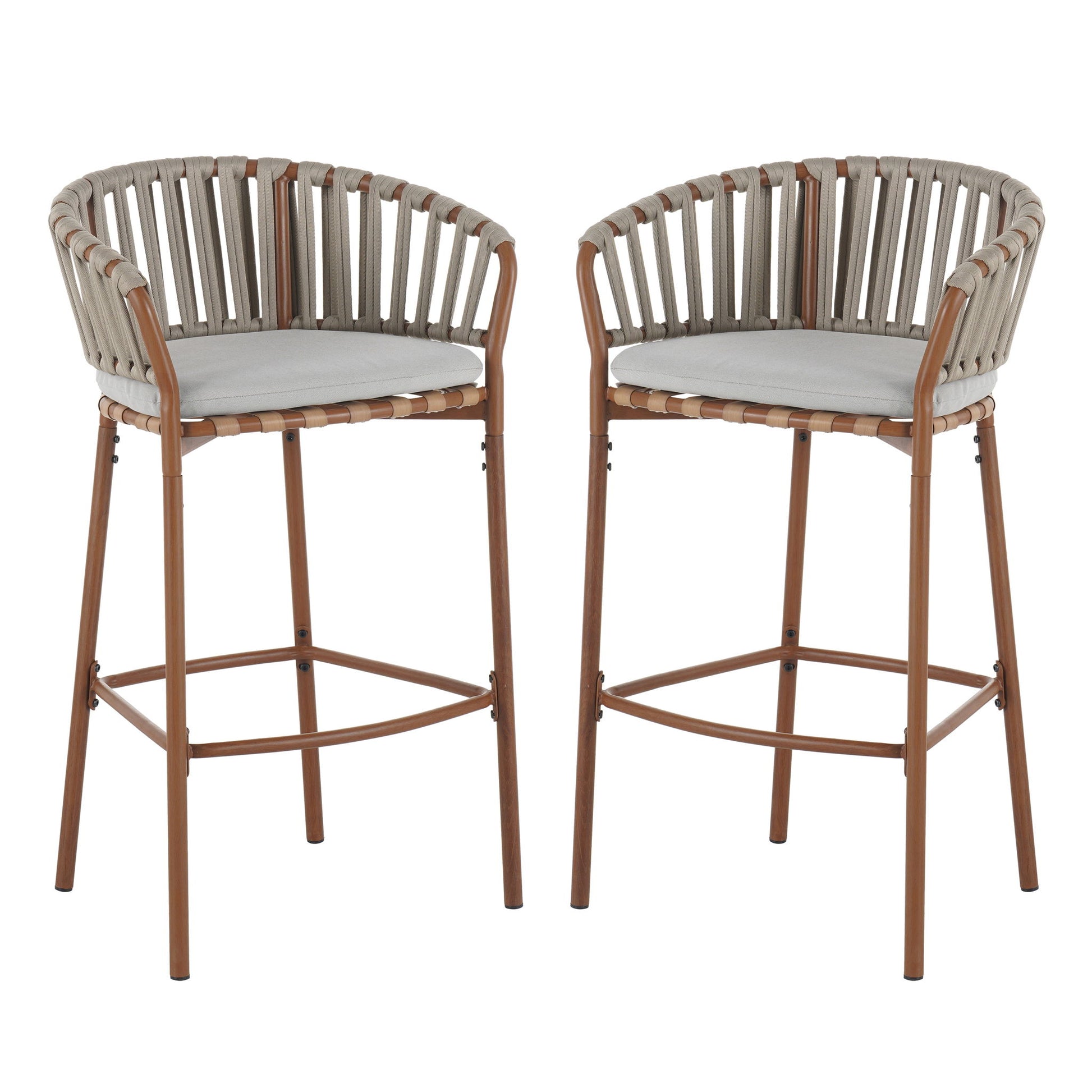 Lodi - Outdoor Matal Rope Barstool, Teak / Beige (Set of 2) - Teak / Beige