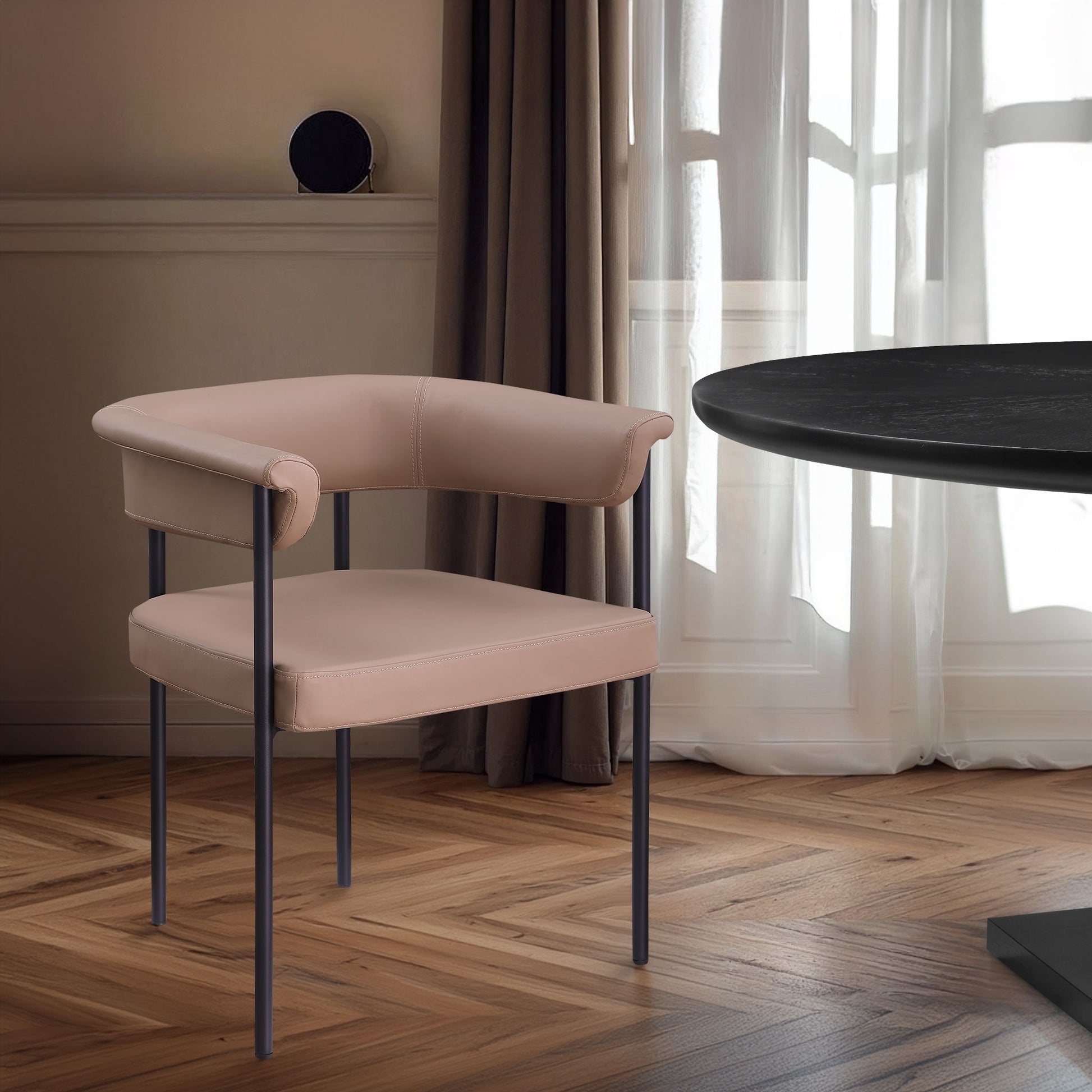 Guests feel comfortable for the whole meal when they're seated in this impressive Malin tan vegan leather dining chair. Its contemporary design effortlessly combines elegance with durability, making it a versatile addition to any dining setting. Perfect for both formal dinners and casual meals, this chair promises not only comfort but also a touch of sophistication to enhance your dining experience. Elevate your decor with this stylish and practical piece that harmonizes seamlessly with modern interiors.