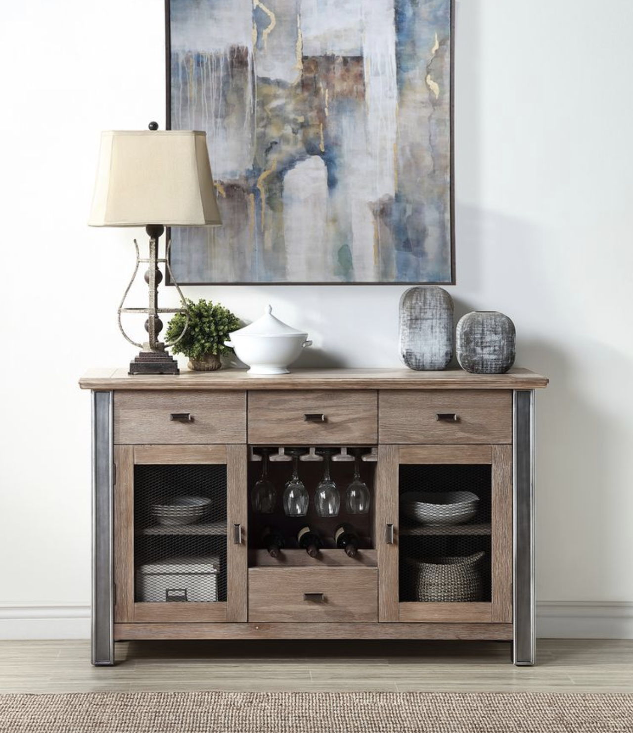 - Ample Storage Space: The server includes 4 drawers, 2 doors with interior compartments, and a wooden shelf. There is also a dedicated rack for wine bottles and glasses, providing organized and versatile storage options.