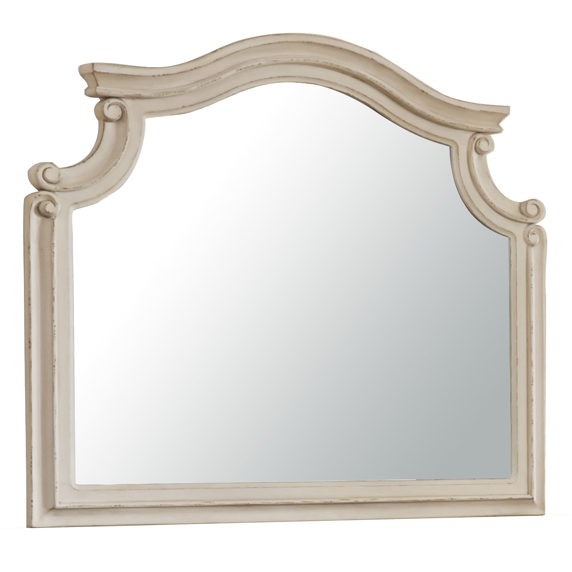 Traditional cottage design. Antiqued two-tone finish featuring chipped white cases with distressed wood finished tops. Tops feature Oak veneers, while the cases are made with engineered wood substrates and Poplar solids. Framed drawer fronts and overlay decorative corbels dress the cases nicely. Ornately shaped headboard with inset upholstered cushion and matching mirror frame. Dovetail drawer construction with ball bearing side glides. B743-93 night stand features an AC power supply with dual USB charging ports. B743-22 (3) drawer vanity, mirror, linen colored upholstered stool. Vanity mirror dimension: 28"W x 1"D x 26"H. Vanity stool dimension: 19"W x 14"D x 18"H. B743-54S/56S double storage drawer footboard features ball bearing side glides and cushioned top rail. Storage footboard and side rails are compatible with the in-line headboard. The bench rail is 8’ deep.