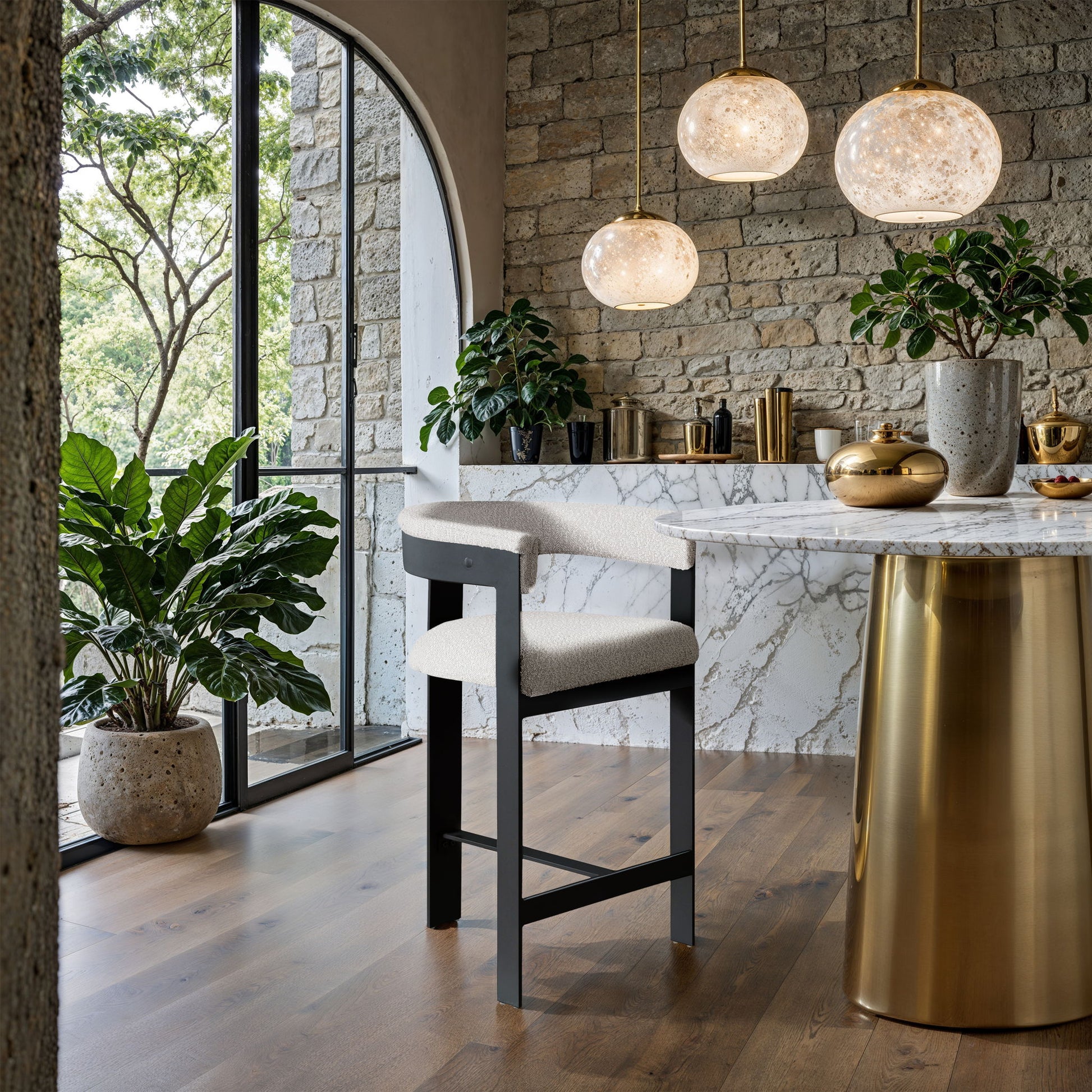 Update your kitchen counter or home bar with this black Romeo boucle stool. It boasts a soft boucle seat and a curved back for comfortable and contemporary seating. The matte black metal frame ensures sturdiness and a sleek aesthetic, impressing family and guests alike. With its modern design, this stool effortlessly complements your space, making it a superb addition to your space.