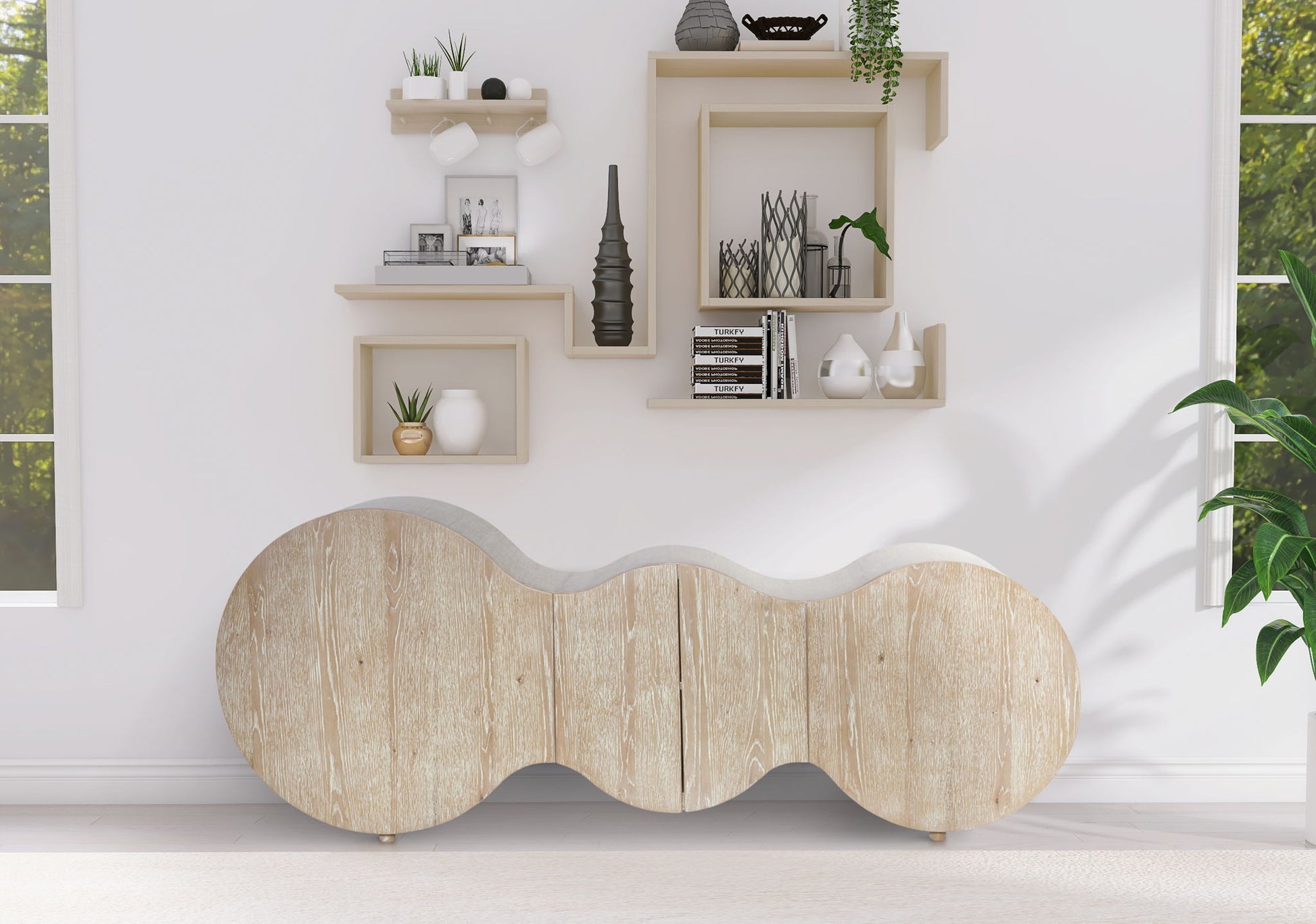 Balance utility with aesthetics with this oak Sono sideboard/buffet, a stunning example of style meeting functionality. Crafted from solid burl wood with a sleek natural finish this pretty sideboard radiates timeless elegance and contemporary sophistication. A distinctive artsy shape makes it a captivating focal point, while the doors open to reveal shelves for storing dining room essentials. Whether it's dinnerware or linens you need to store close by, this piece offers both artistic flair and practicality.