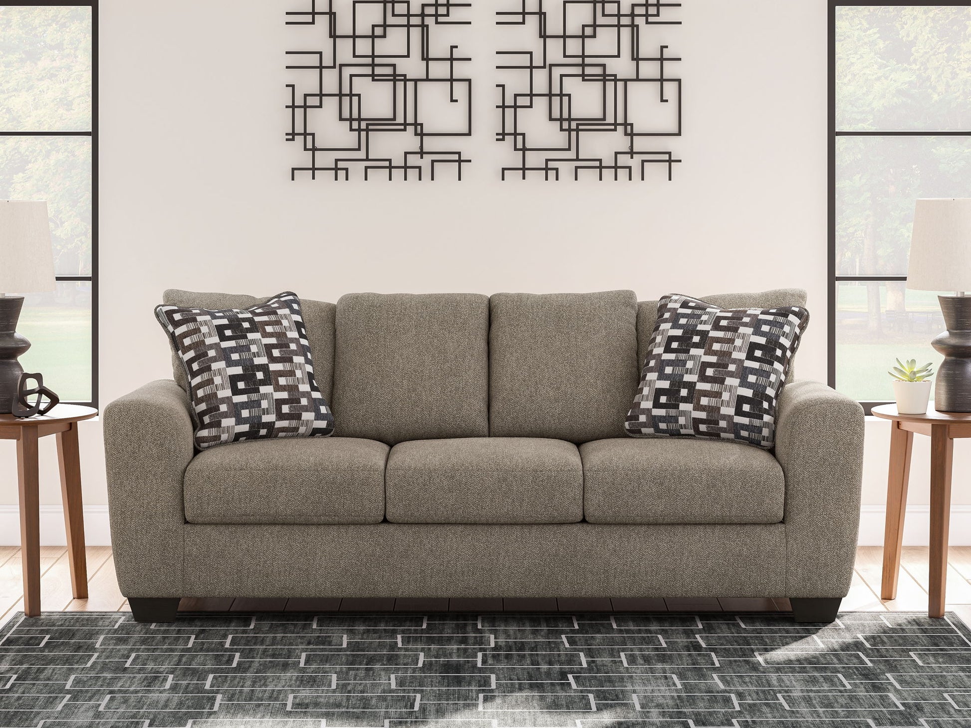 Transitional and right on trend. This seating set's upholstery is a delightful change from the ordinary, with hints of soft brown giving the gray hue added depth. It’s punctuated with chic accent pillows in an eye-catching, stylized stripe design. Whether you're hosting friends and family or relaxing solo, this set invites homey, comfortable character into your space.