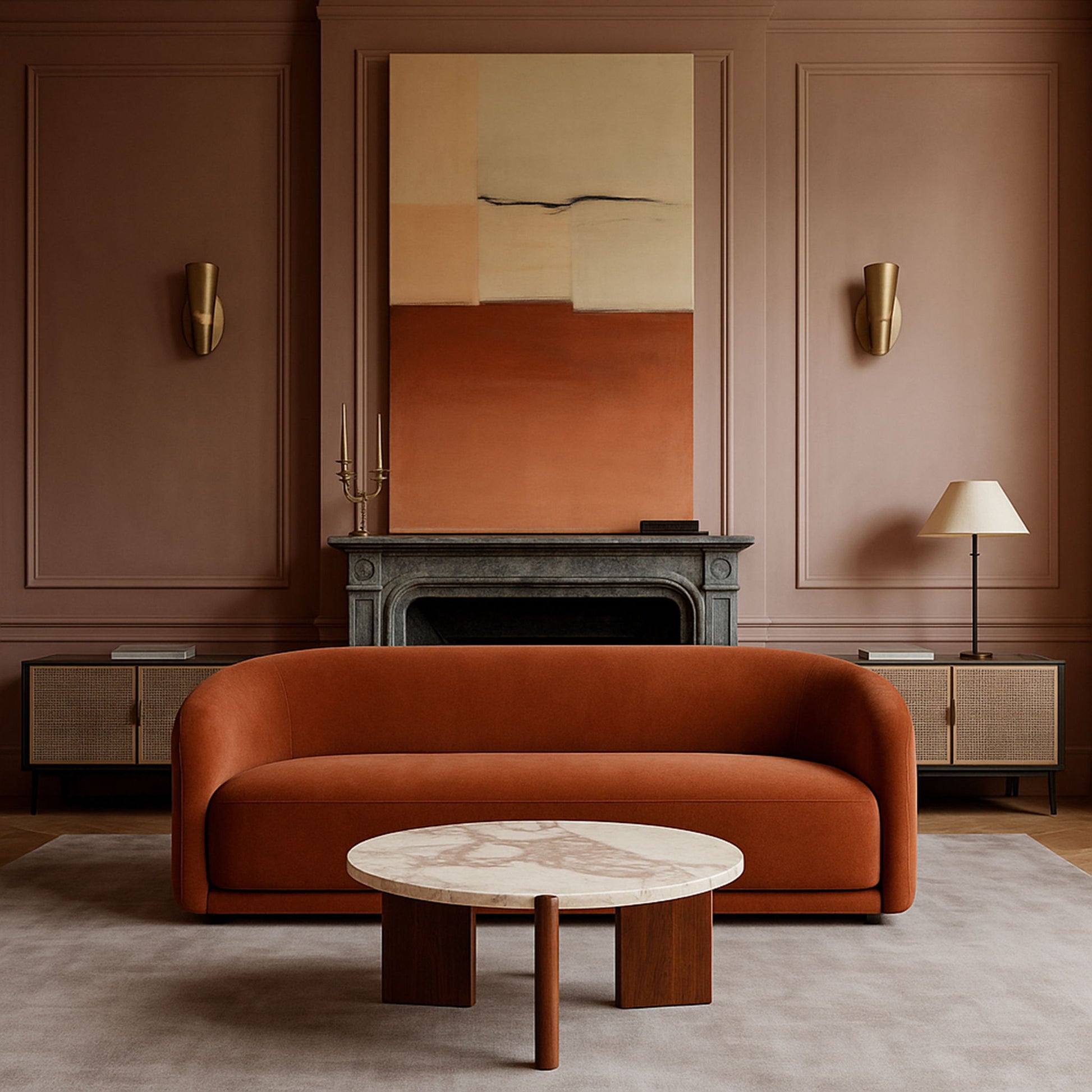 A fusion of natural elegance and bold structure, the Varenna breccia marble top and acacia wood base coffee table showcases cream marble with striking brown veining. Solid acacia legs in a deep brown finish provide a grounded contrast, bringing warmth to its Art Deco-inspired form. Designed to stand out yet blend effortlessly, this piece refines any living space with timeless sophistication.